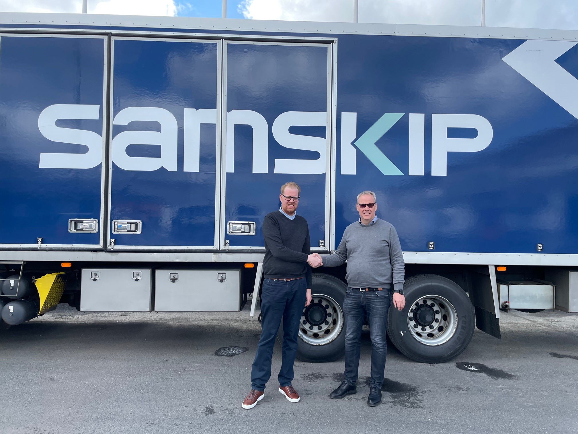 Myndin er af Böðvari Sturlusyni og Inga Þór Hermannsyni forstöðumanni Samskip Innanlands að handsala samninginn.